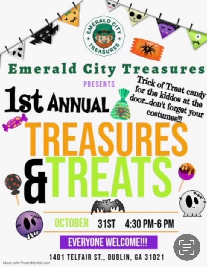 Emerald City Treasures is hosting its First Annual Treasures and Treats at 1401 Telfair St on October 31st from 4:30 PM to 6 PM.