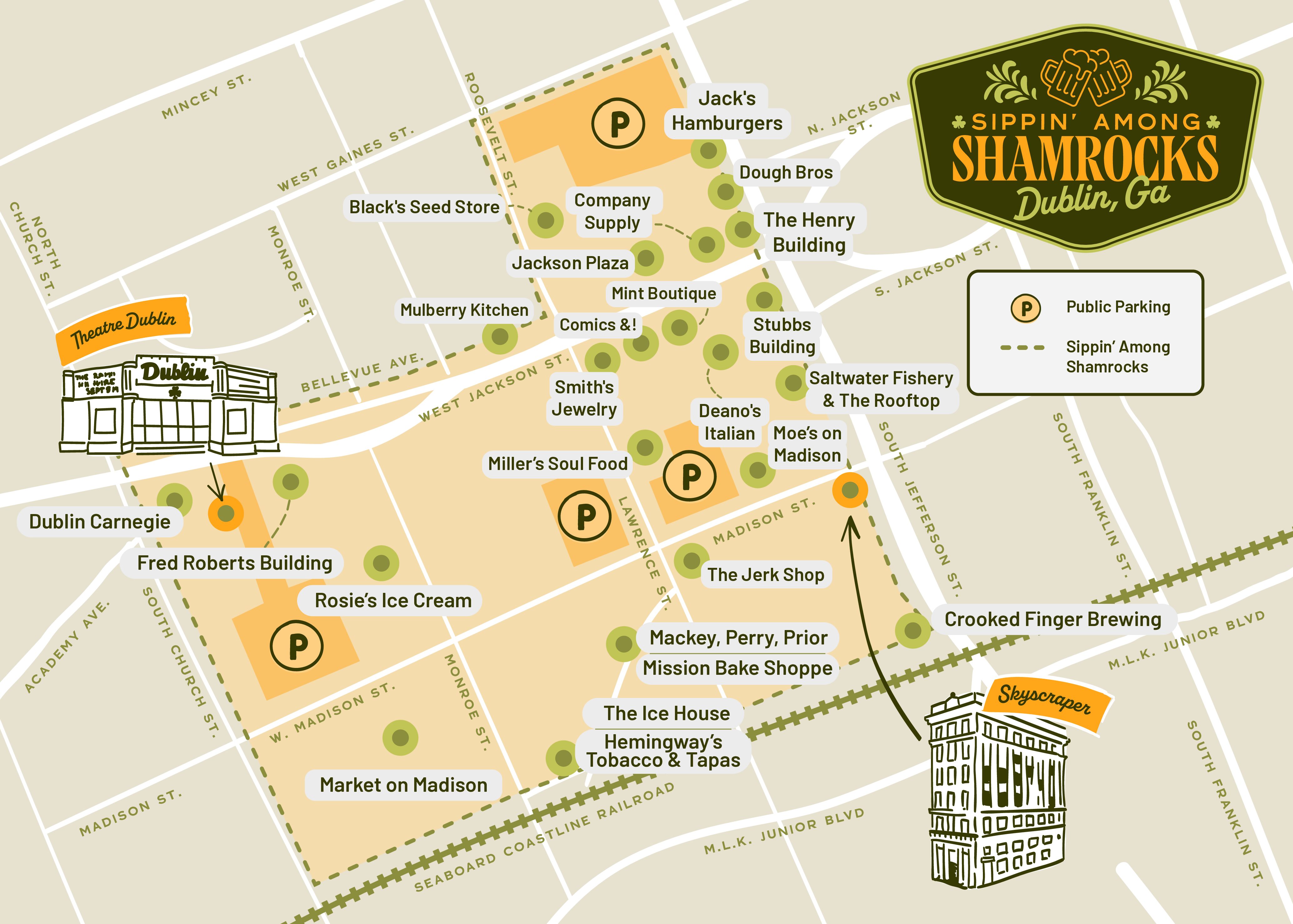 Located in the heart of downtown Dublin, the Sippin’ Among Shamrocks district is easy to find and even easier to enjoy. Park nearby, then stroll from spot to spot as you discover flavors, music, and moments worth savoring.